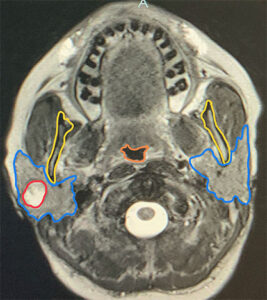 Unfortunately not. The facial nerve is not visible on any scans, so when on a scan a tumor is seen in the parotid gland, it is impossible to tell if there is a nerve adjacent or inside the tumor.